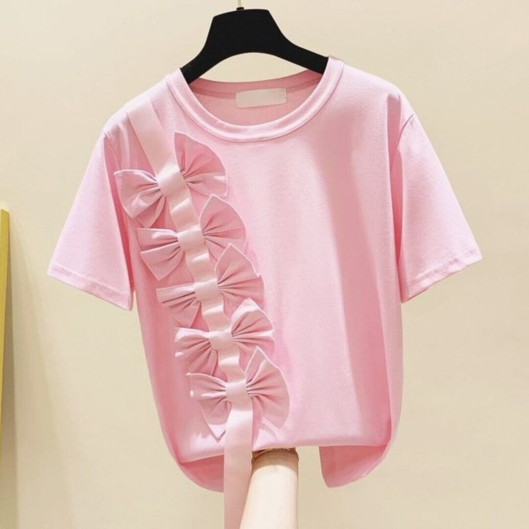 リボンステッチ装飾 半袖 Tシャツ