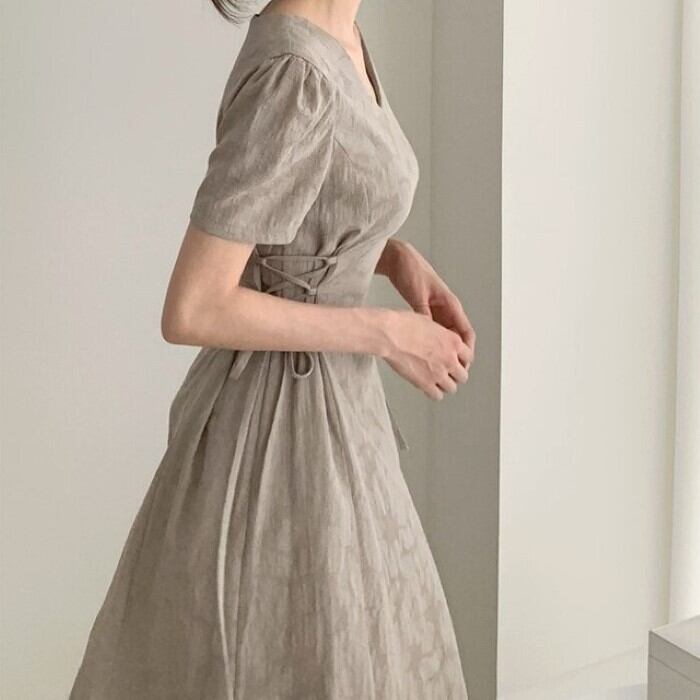 フレンチ柄 Vネック サイドストラップ ワンピース