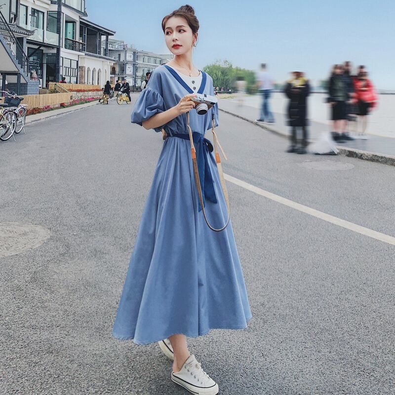 ブルー フレンチ レトロ パフスリーブ ドレス