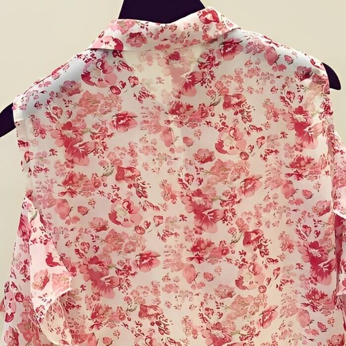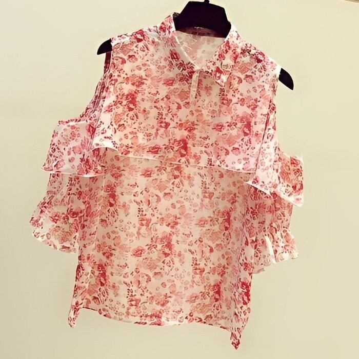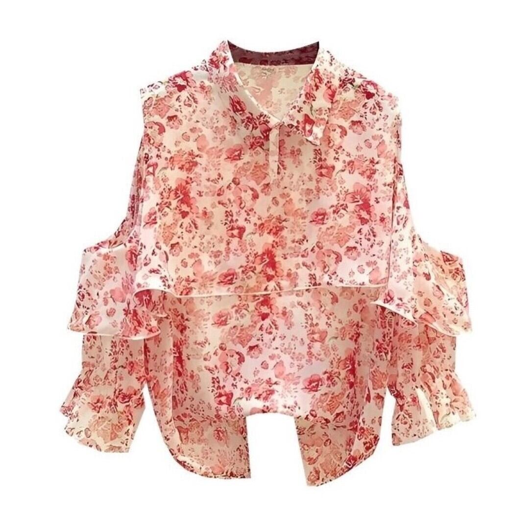 フリルステッチフローラル ストラップレス シフォンシャツ