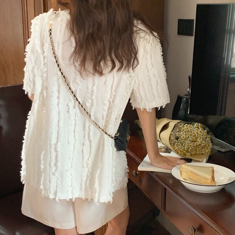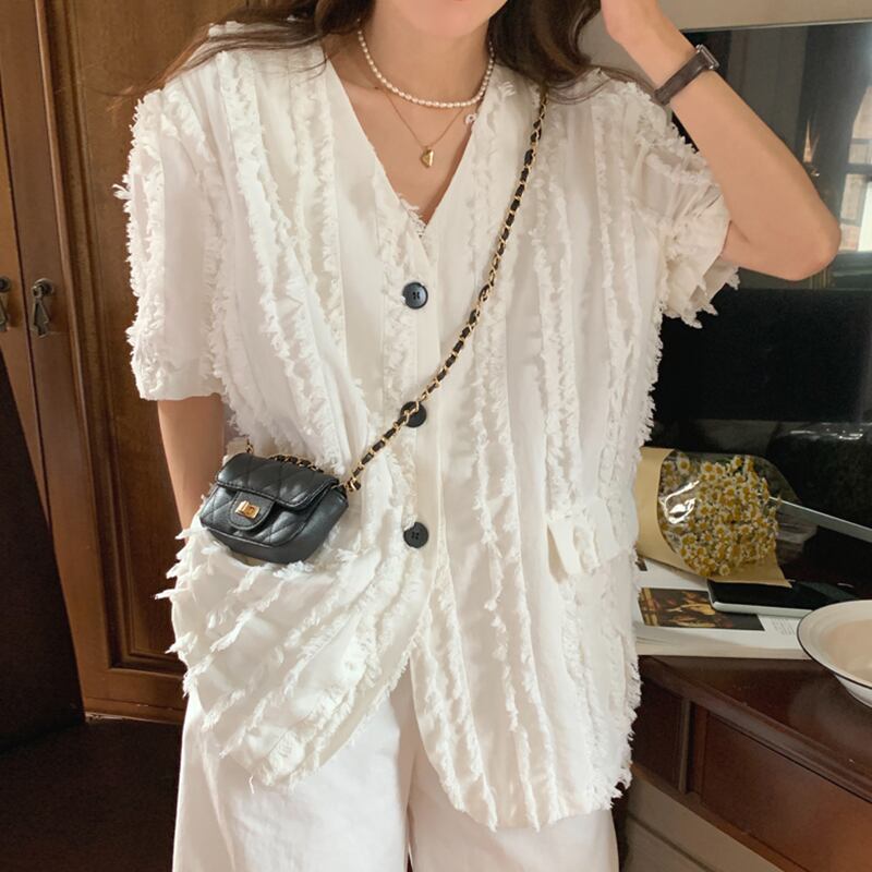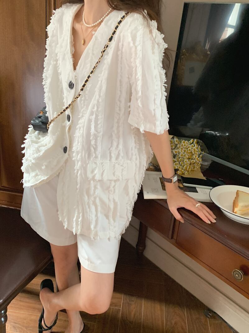 Vネック 3ボタンデザイン フリンジ 半袖ジャケット