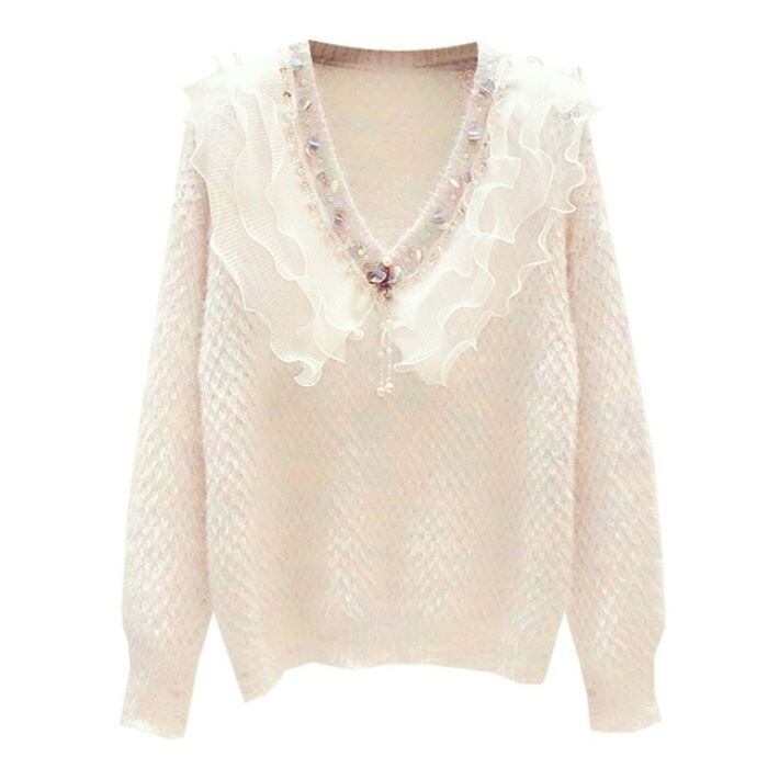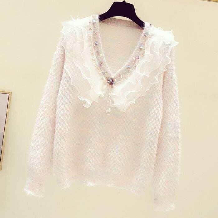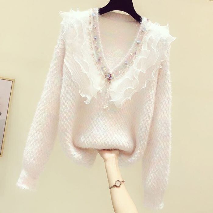 フリル Vネック ビーズスパンコール セーター