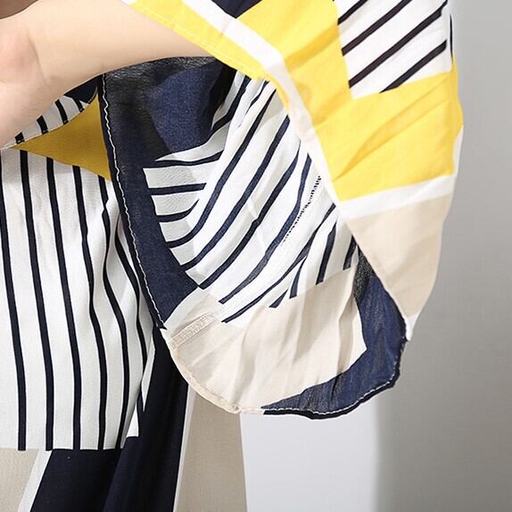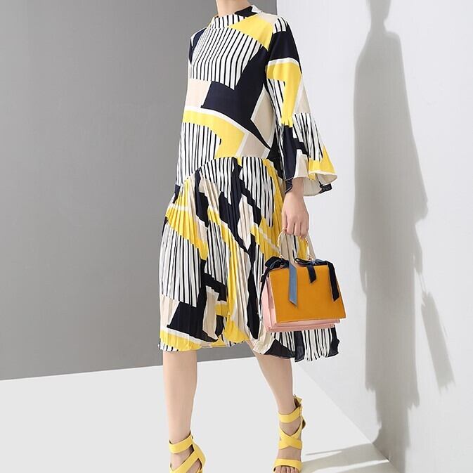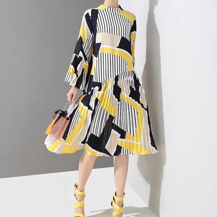 ユニークパターンプリント フリルスリーブ プリーツ ワンピース