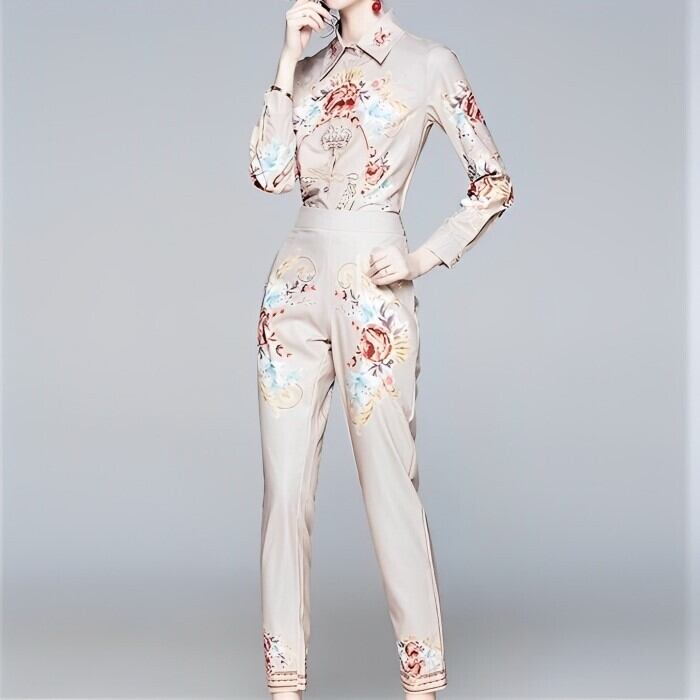 エレガント プリントシャツ+パンツセット