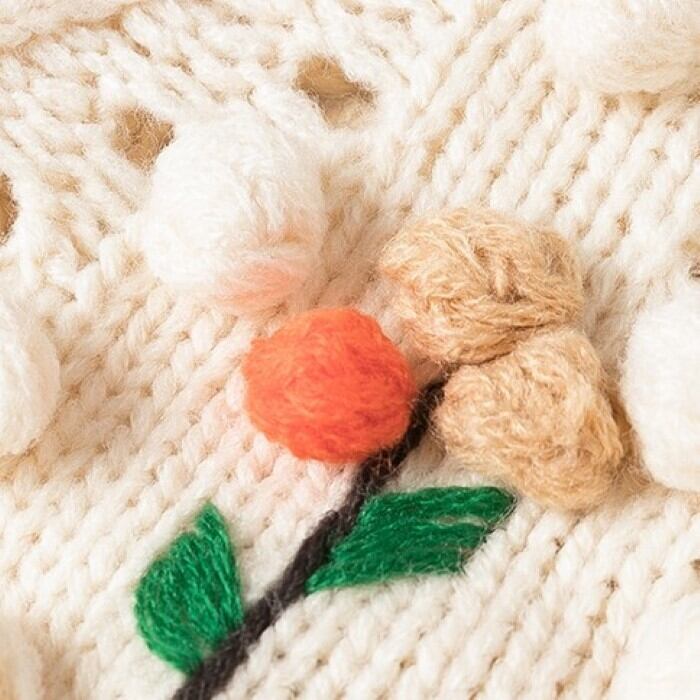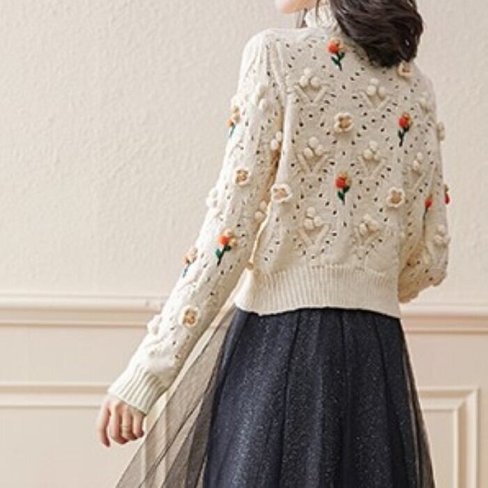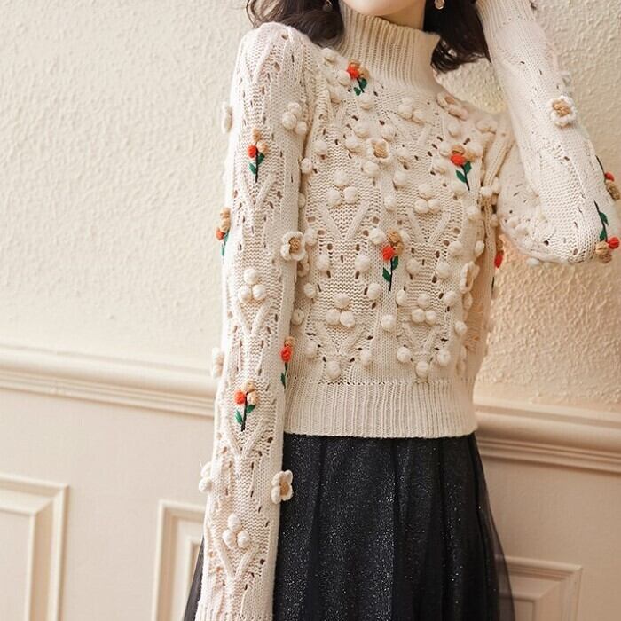 立体ボール装飾 刺繡 ハイネック フラワー セーター
