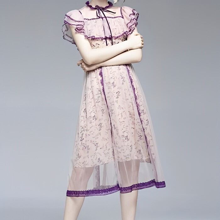 ハイウエスト レース フリル メッシュステッチ ワンピース