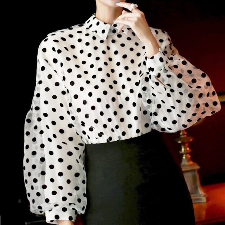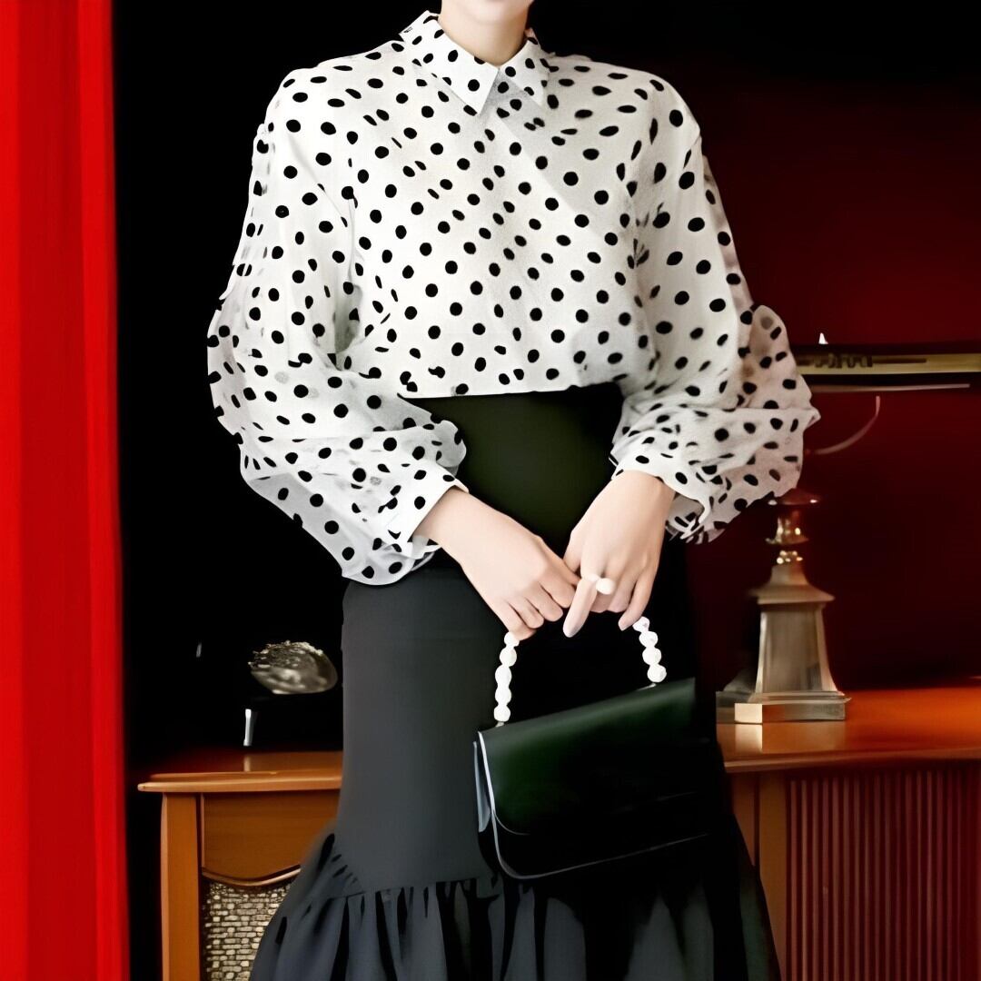 ドット柄 ポロカラー パフスリーブ ブラウス