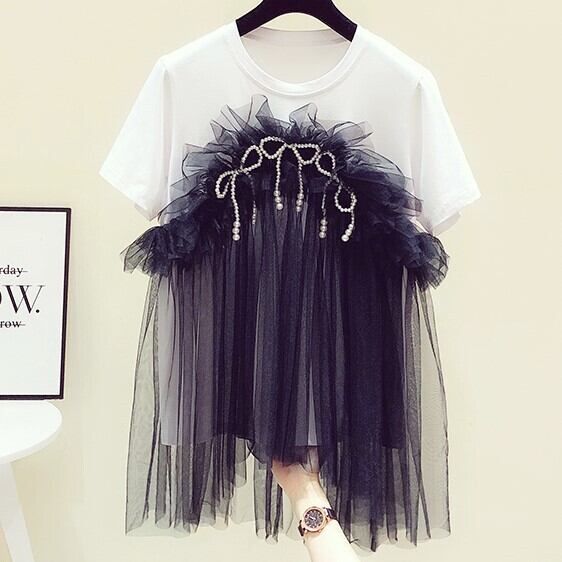 メッシュステッチ ビーズ 半袖 ルーズTシャツ