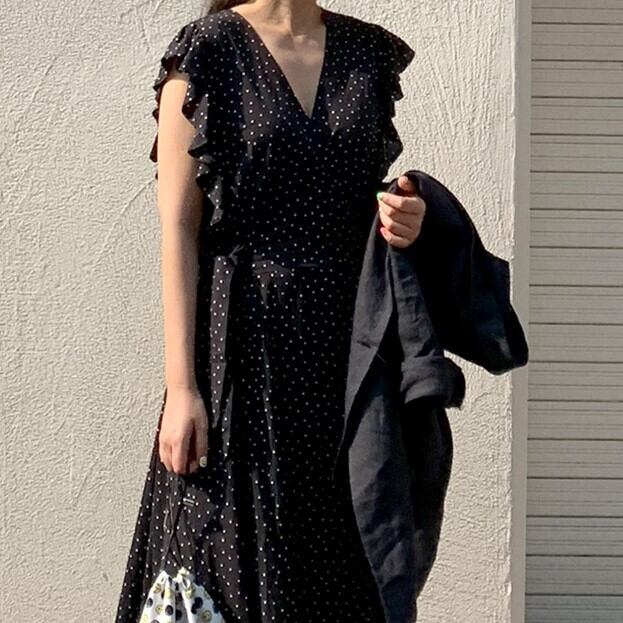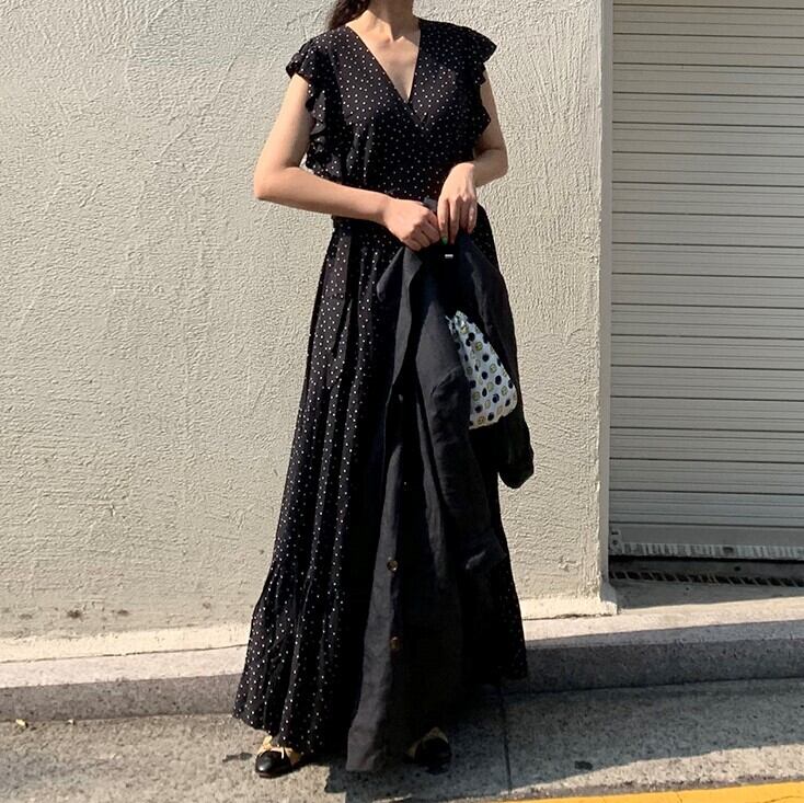 Vネック ドット マキシワンピース